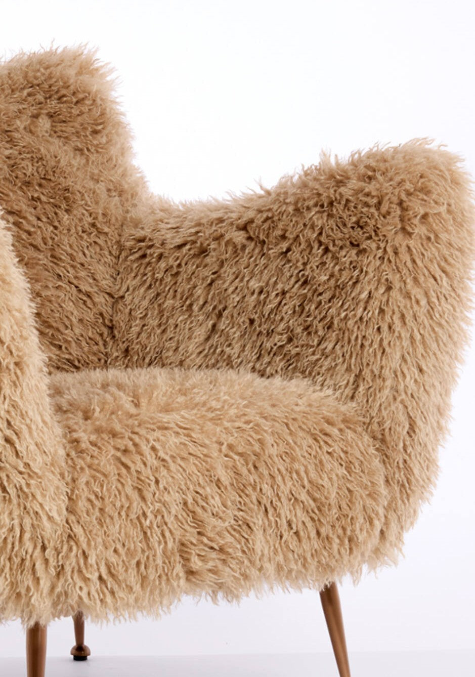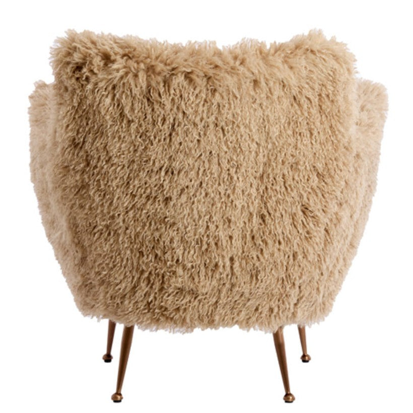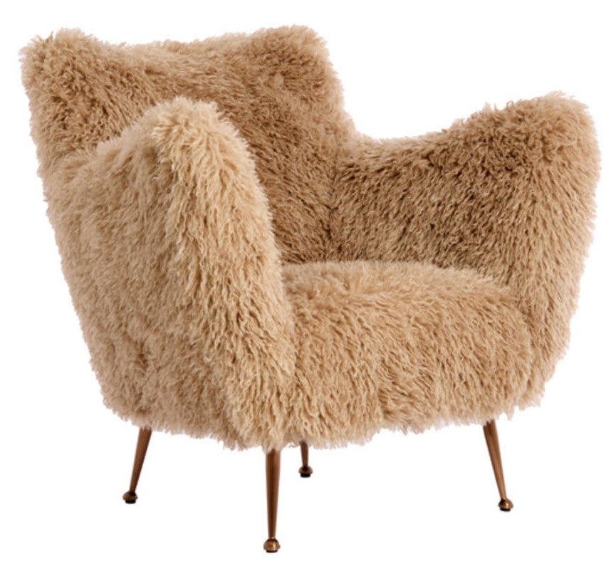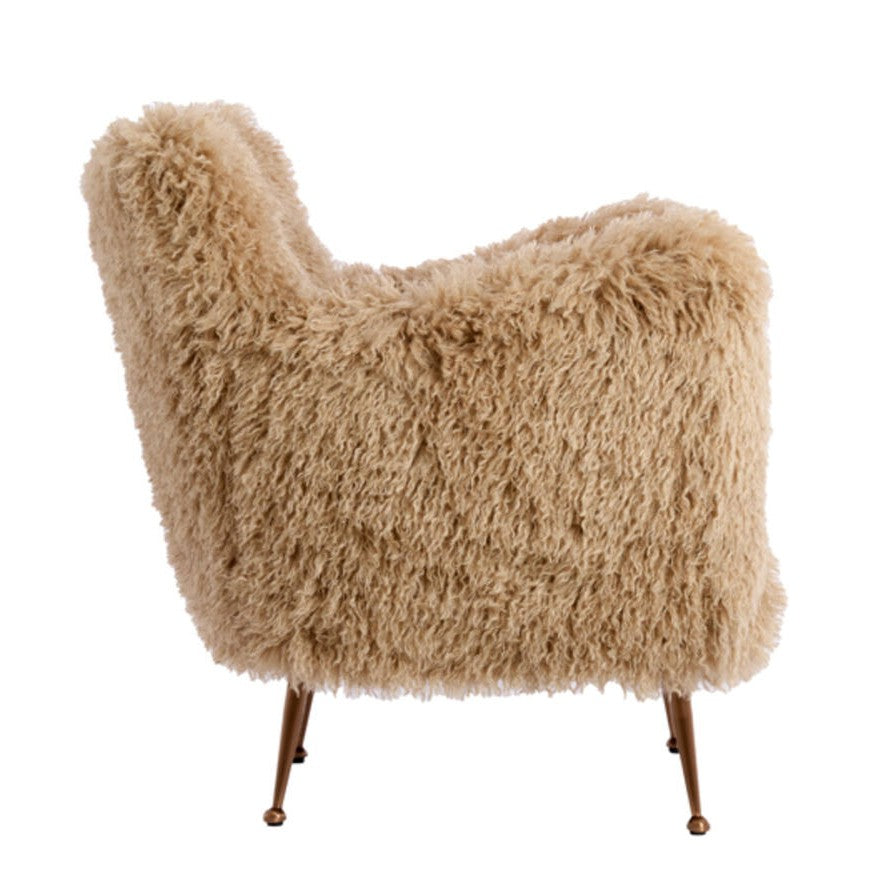 Questa poltrona in ecopelliccia beige con piedi in metallo colore rame unisce comfort e stile contemporaneo. Un pezzo di design ideale per salotto, camera da letto o angolo lettura.